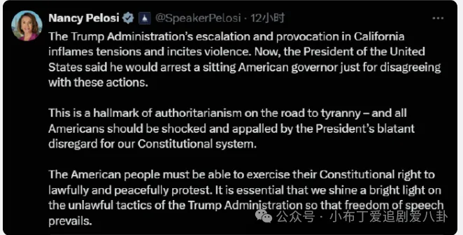 “美國總統説,他將逮捕一位在任的美國州長,只是因為後者不同意這些行動。”佩洛西稱,“這是通往暴政之路上獨裁主義的標誌——所有美國人都應該對總統公然無視我們的憲法制度感到震驚和驚駭。”