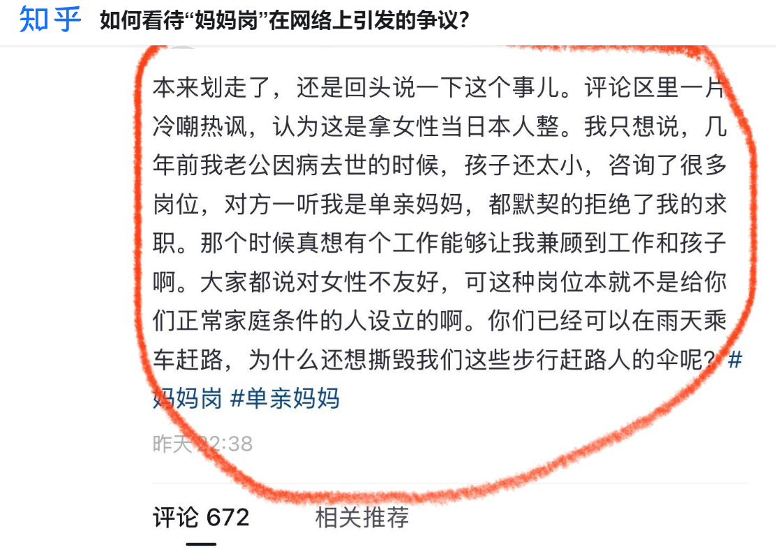而那些沒有生娃的女性,卻感到了一絲恐慌。因為這種鼓勵招聘媽媽崗的行為,顯然威脅到了女拳羣體。