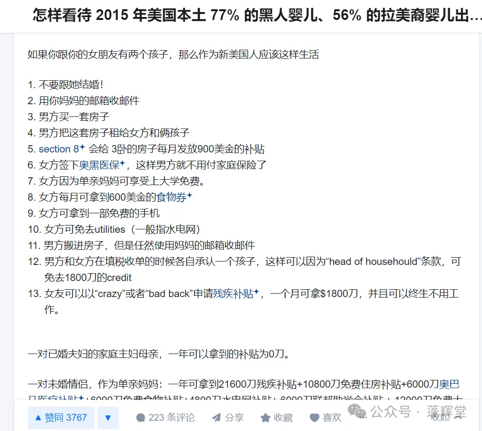 為了這種補貼,很多美帝底層家庭,故意搞假離婚,故意搞成單親家庭,故意製造出單親媽媽帶2、3個娃的社會效果,所以美帝那邊,黑人和老墨單親媽媽比例特別高。