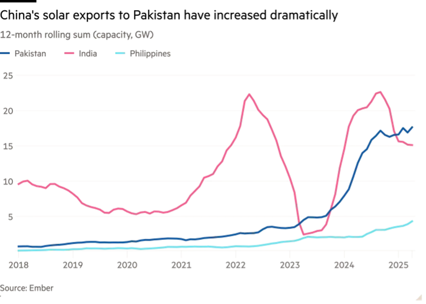 中國對巴基斯坦太陽能出口情況(2018-2025年)。圖源:Ember