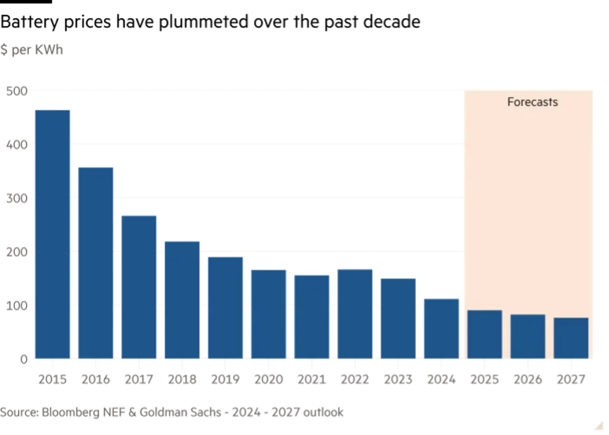 巴基斯坦過去十年電池價格變化趨勢與未來三年情況預測(2025-2027年)。圖源:Bloomberg NEF&Goldman Sachs