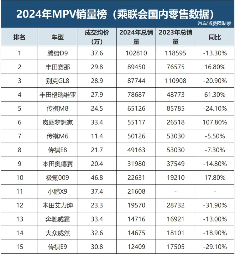 然而,在理想 MEGA 沉淪的一年中,市場競爭格局發生了巨大變化。2024年,比亞迪旗下的騰勢D9,以超過10萬輛的成績成為MPV年度銷量冠軍,是其繼2023年取代別克GL8獲得冠軍寶座之後,再次摘得桂冠。