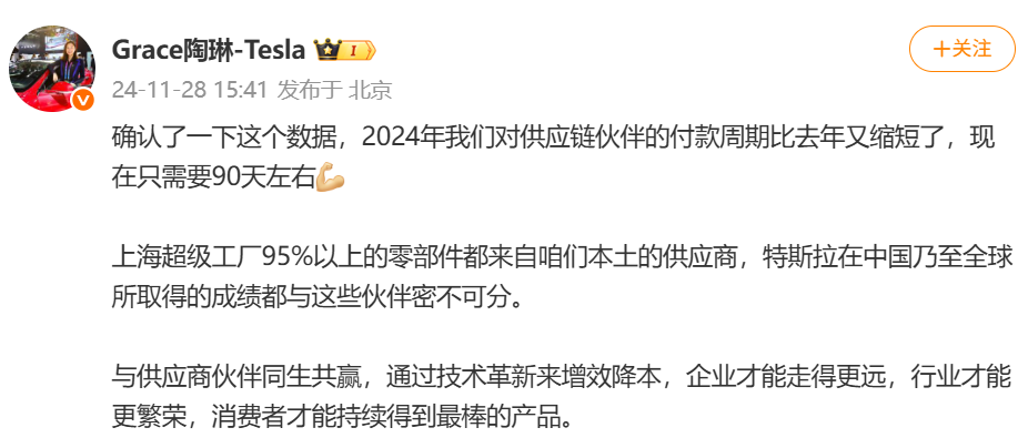 去年,特斯拉副總裁陶琳曾發微博炫耀,説特斯拉的付款週期壓縮到了 90 天左右。