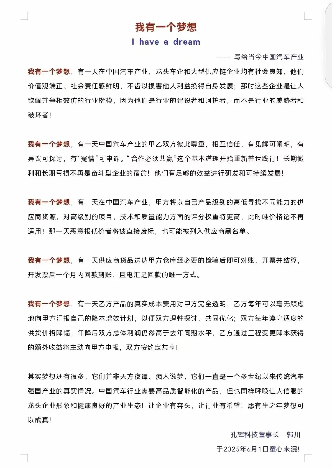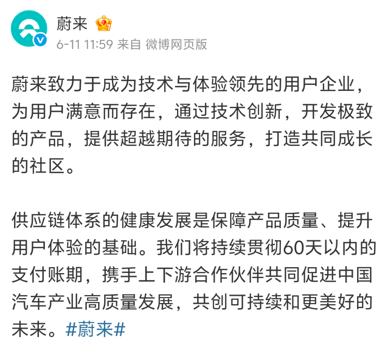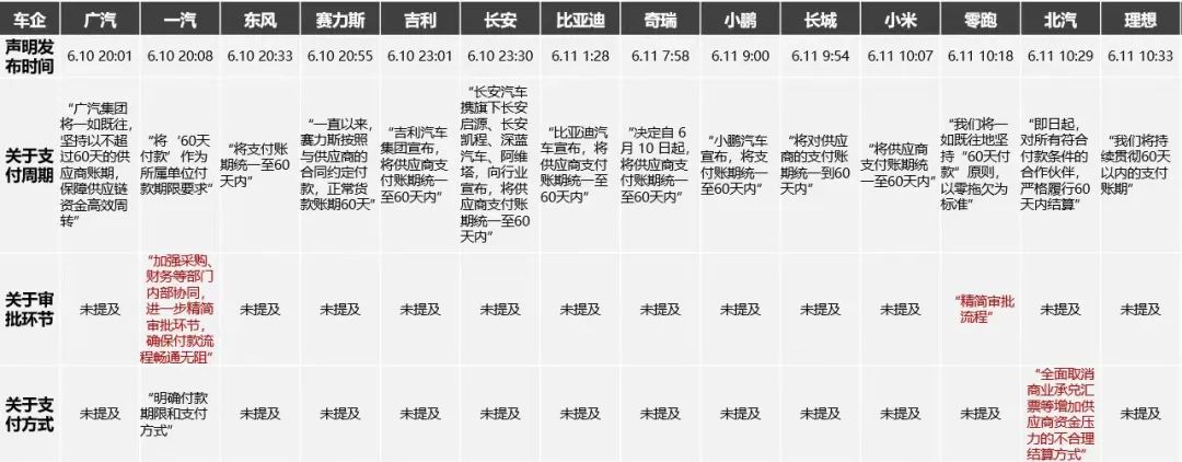到了第二天,奇瑞、長城、北汽、上汽、江淮全説自己要做到賬期 60 天內,還有小米、小鵬、理想、蔚來這些新勢力也紛紛響應。