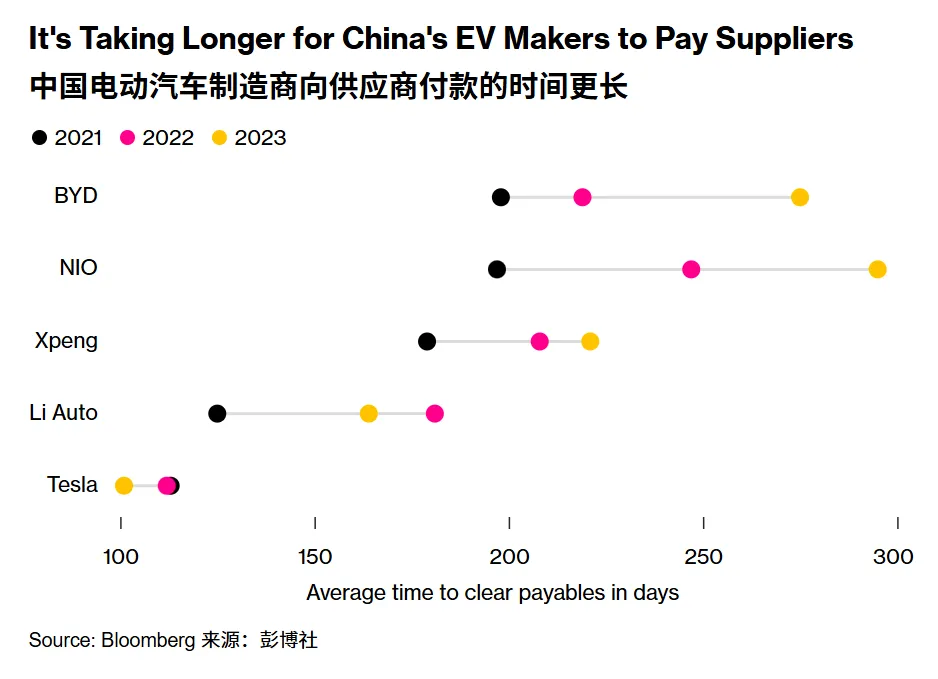 她還引用了一個彭博社的數據,表中顯示比亞迪、蔚來、小鵬、理想這幾位的付款週期,明顯長於特斯拉。