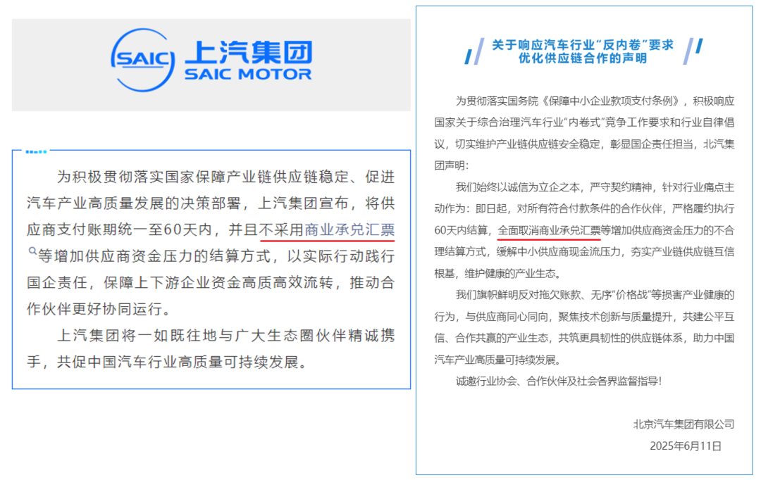 而在車企們的表態裏,目前只有北汽和上汽兩家,明確提到不用商業承兑匯票。
