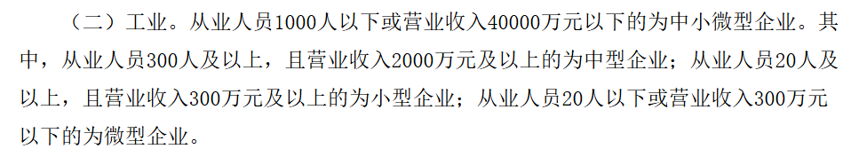 這個大型、中小企業咋區分呢?我翻了下,目前有個 《 中小企業劃型標準規定 》 説了,工業行業,1000 人以下或者營業收入 4 億元以下的,是中小微企業,在這以上的就算大型企業。