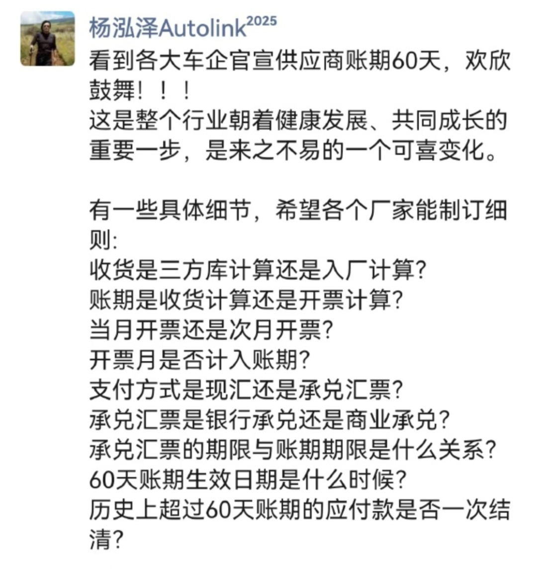 雖然賬期問題可能還需要一些時間才能徹底解決,但不管怎麼説,這次車企們集體承諾 60 天賬期,這事兒肯定是有積極意義的。