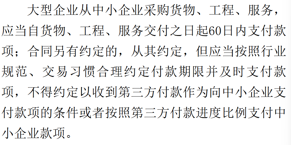 《條例》之所以修訂,就是為了解決拖欠貨款的問題,裏頭規定:大型企業從中小企業採購貨物、工程、服務,應當自貨物、工程、服務交付之日起 60 日內支付款項。