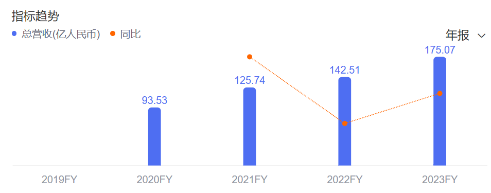 比如電子產品電池供應鏈企業深圳就很多,而在2011年在深圳就新成立了一家做移動電源等硬件的公司,叫做安克創新,下圖是其近幾年的營收增長,2023年比2020年增長了80%多,從90多億增長到170多億人民幣了。
