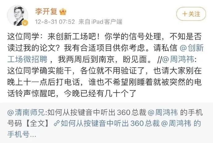 後來李開復看到了,還發微博邀請這個大學生面談,説他在信號處理等各方面都很有實力,希望他加入創新工場。