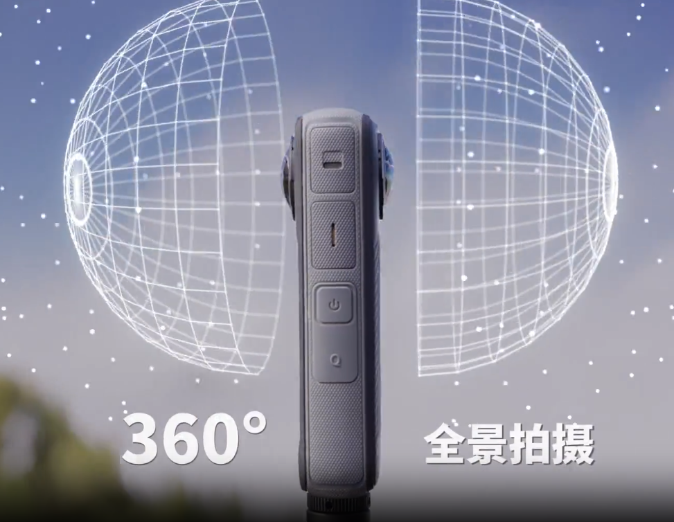 而全景相機,下圖是影石現在在售的全景相機,它兩面都有攝像頭,各負責超過180度的角度,拼接起來裁切掉一部分後就可以拍出全景的效果.