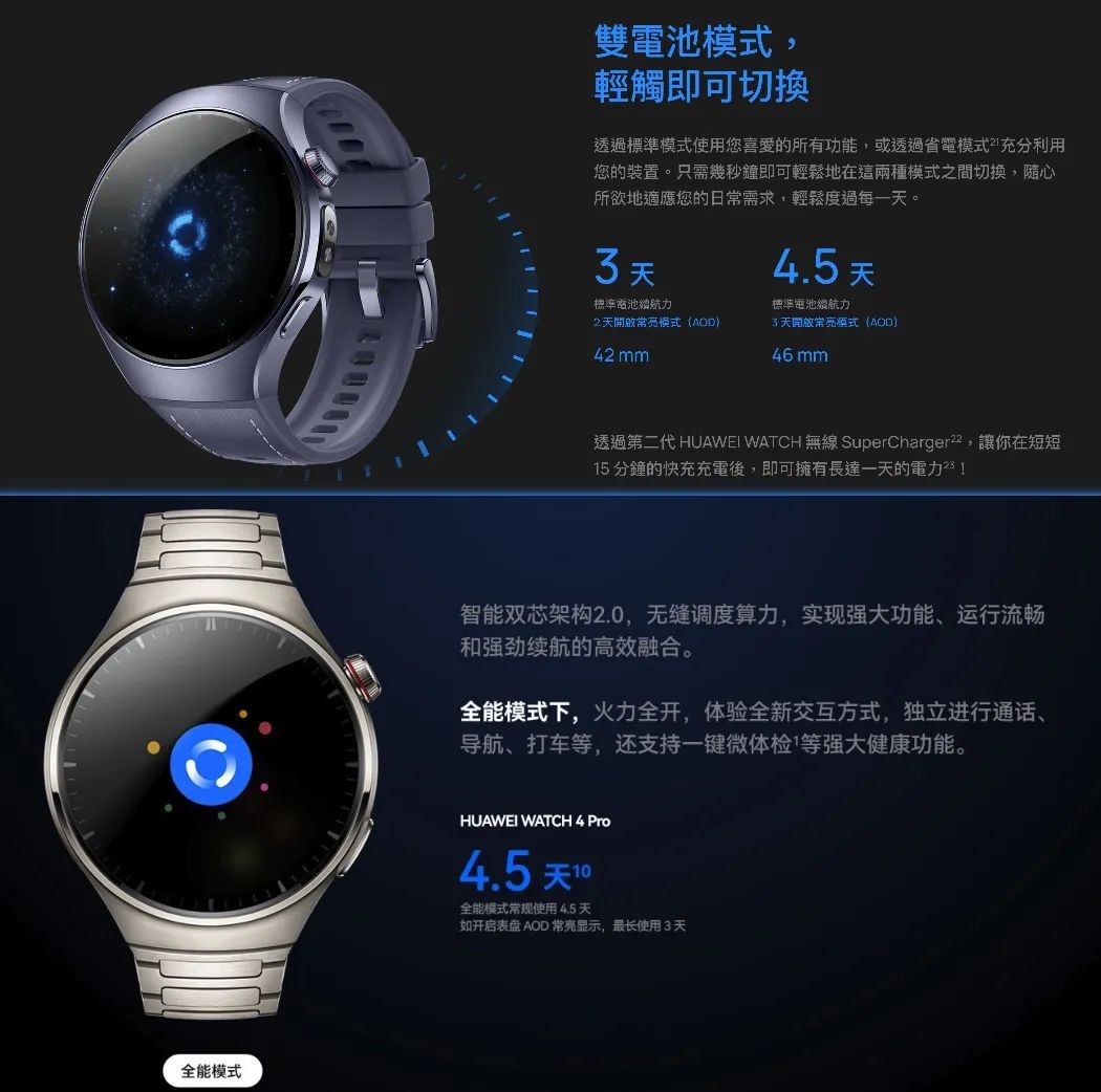 從官方的數據來看,46mm款在全能模式下的續航是4.5天,跟之前48mm的WATCH 4 Pro保持一致。