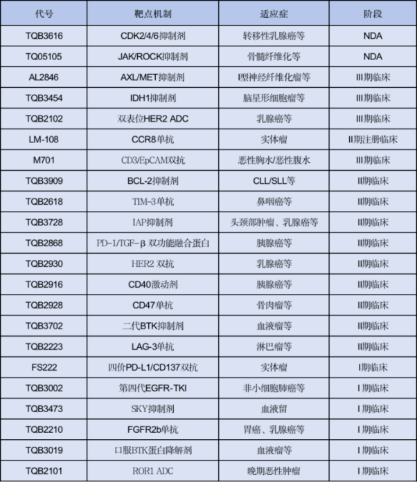 根據2024年財報,進入臨牀階段的腫瘤創新管線共有36個,包括3個處於NDA階段,8個處於臨牀3期或註冊臨牀,11個處於2期臨牀。