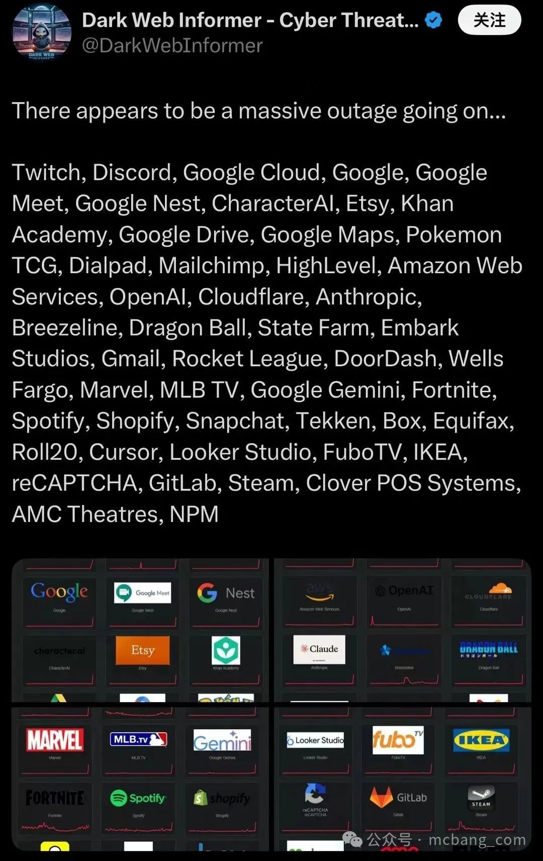 據統計本次受影響的包含:Twitch、Discord、Google Cloud、Google、Google Meet、Google Nest、Character Al、Etsy、Khan Academy、Google Drive、Google Maps、Pokemon TCG、Dialpad、Mailchimp、High Level、Amazon Web Services、Open Al、Cloudflare、Anthropic、Breezeline、Dragon Ball、State Farm、Embark Studios、Gmail、Rocket League、DoorDash、Wells Fargo、Marvel、MLB TV、Google Gemini、Fortnite、Spotify、Shopify、Snapchat、Tekken、Box、Equifax、Roll20、Cursor、Looker Studio、Fubo TV、IKEA、reCAPTCHA、GitLab、Steam、Clover POS Systems、AMC Theatres、NPM等,可以説是海外的互聯網半壁江山了。