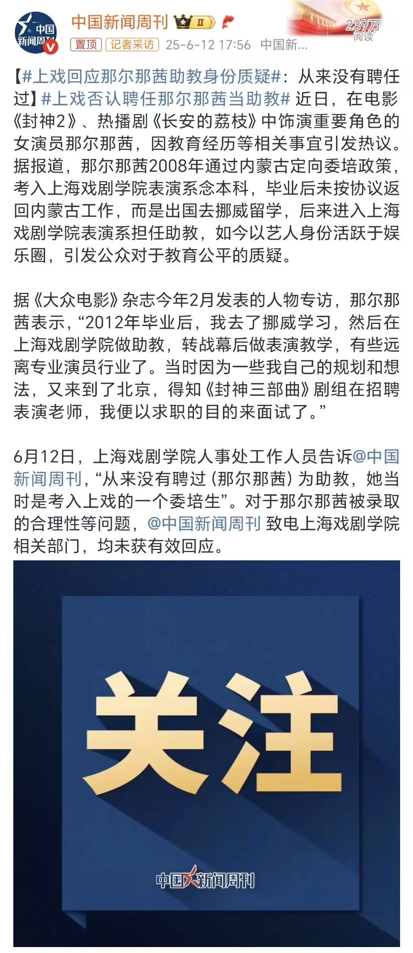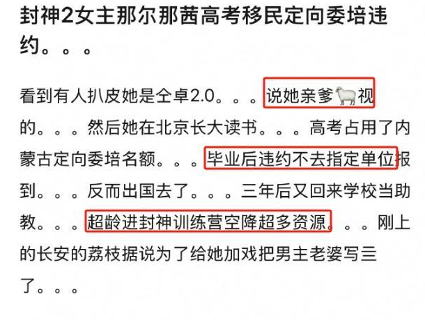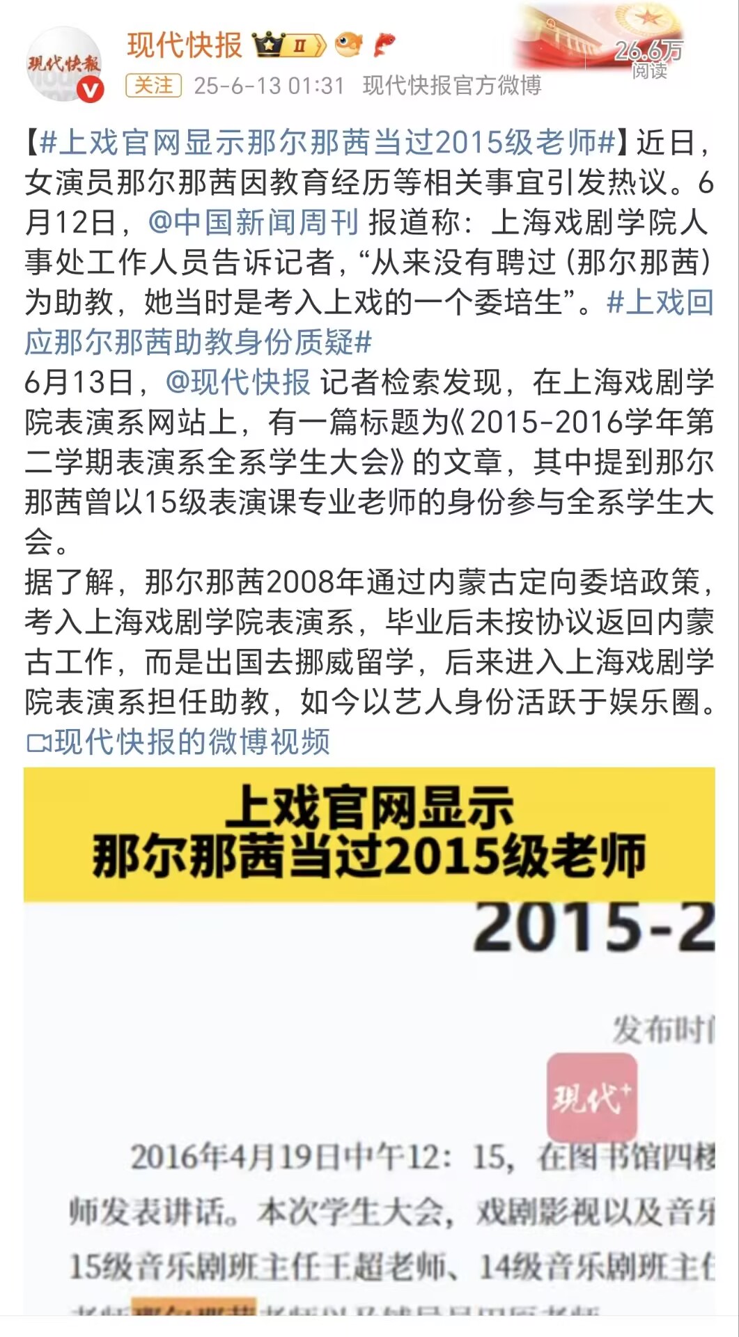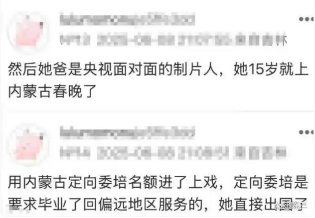 首先是在2025年6月10日的時候,演員那爾那茜被曝出2008年通過內蒙古定向委培政策考入上海戲劇學院,享受降分錄取和“畢業包分配公務員”的紅利,卻未履行協議返回內蒙古工作,而是違約出國深造,三年後回國進入娛樂圈。