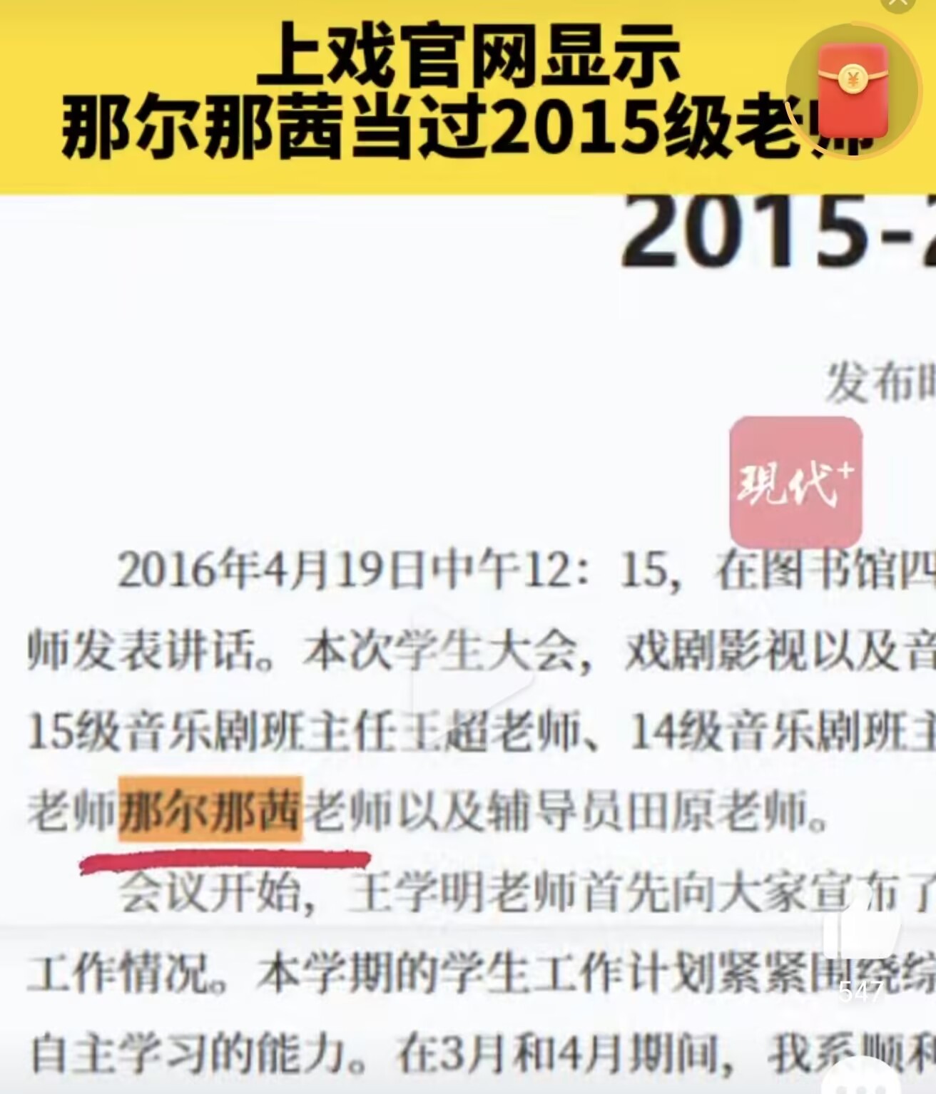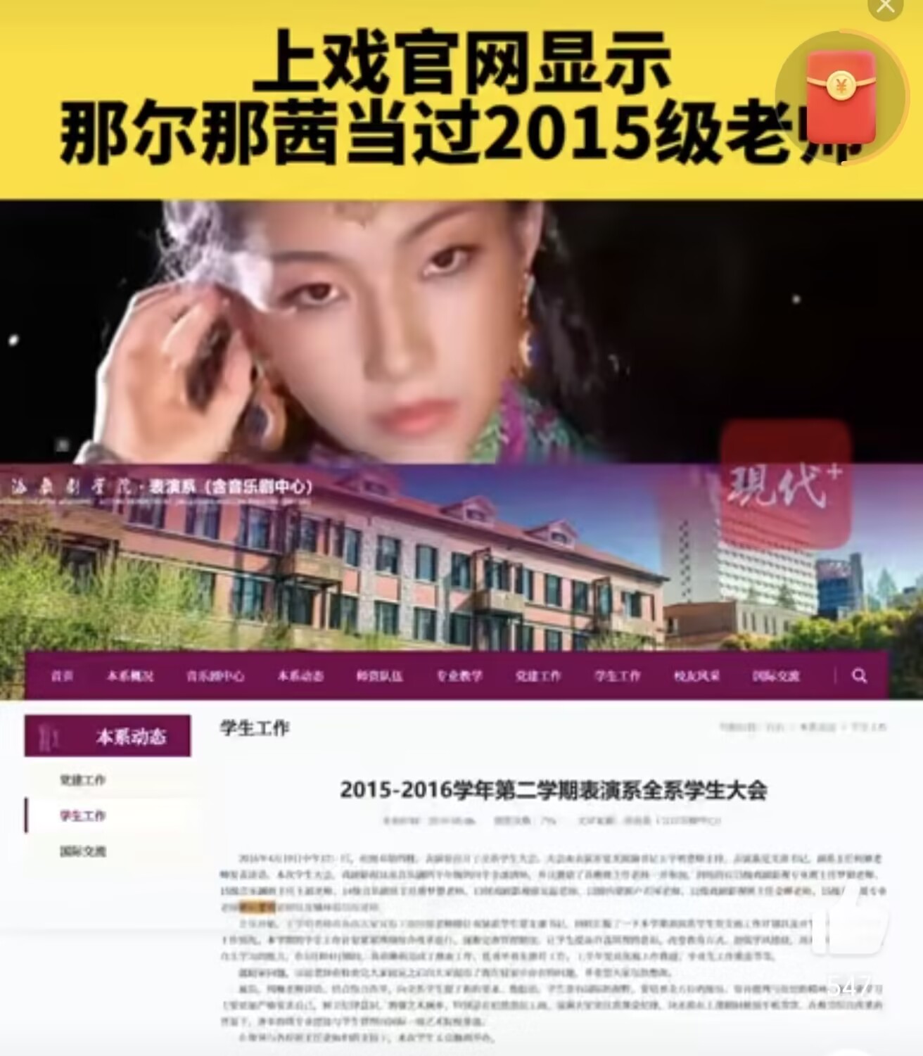 後據現代快報相關消息,在上戲官網的一篇名為《2015-2016學年第二學期表演系全系學生大會》的文章中,那爾那茜以15級表演課專業老師的身份參與全系學生大會。