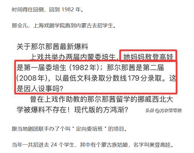 雖然之前那爾那茜佔據定向委培生名額,卻最終未履行協議讓人生氣,但有網友發現,從內蒙到上戲委培生只有兩屆,第一屆招生是在1982年的時候,那時那爾那茜的母親奧登高娃就是被招募的學生之一。