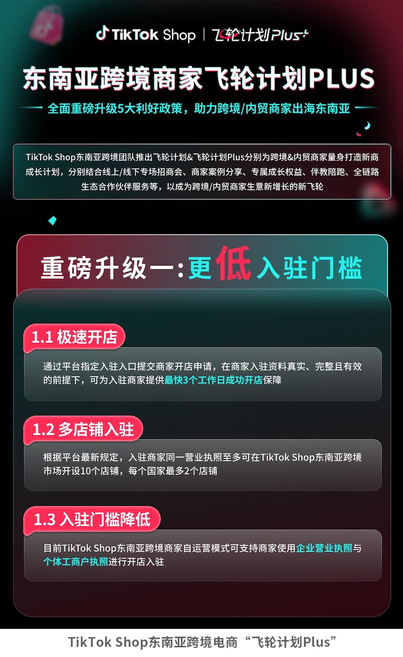此刻入局的商家,也將踩在政策紅利的爆發節點上。TikTok Shop東南亞跨境電商全新升級的“飛輪計劃Plus”降低了入駐門檻:通過極速審核系統,資質審核最快 3 個工作日辦結;個體工商户憑營業執照即可叩開東南亞市場大門;“一證多國”的擴張效率,讓傳統跨境電商的籌備週期不斷縮短。