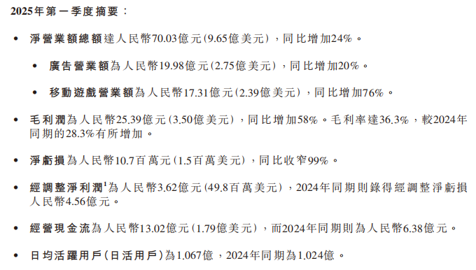 2025年第一季度,B站營收及經調整淨利潤均實現增長;經營毛利同比增長58%至25.39億元;經營現金流13.02億元,相比上年同期6.38億元顯著增加。