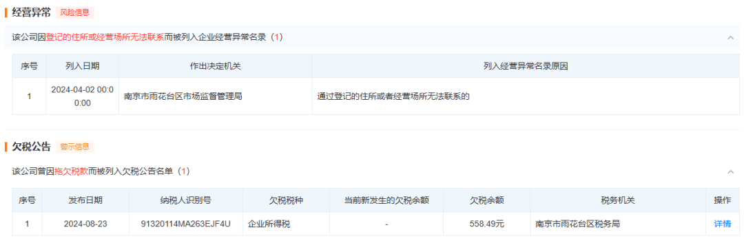 存在其他問題的公司還有不少。例如同樣在B站投放相親類廣告的碼甲科技(南京)有限公司,一方面存在註冊資本偏低、實繳資金不足等瑕疵,另一方面還存在欠税、註冊地存在異常等情況。