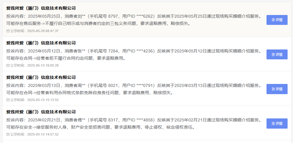 除了商家主體經營資格資質等問題,這些公司提供的服務或商品,也頻頻出現在消費者投訴平台上。根據全國12315消費投訴信息公示平台,愛我所愛提供的婚介服務被多次投訴,要求退費賠償。
