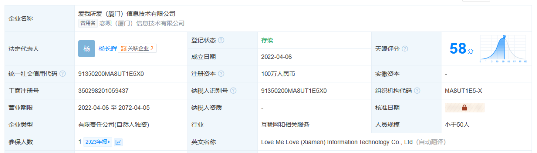 以其中一則相親廣告為例,其背後主體顯示為愛我所愛(廈門)信息技術有限公司(以下簡稱“愛我所愛”)。根據天眼查,該公司註冊資本為100萬元,由法定代表人百分百出資。資料顯示,該公司主要人員僅有兩人,而參保人數僅為一人,或有“空殼化”嫌疑。