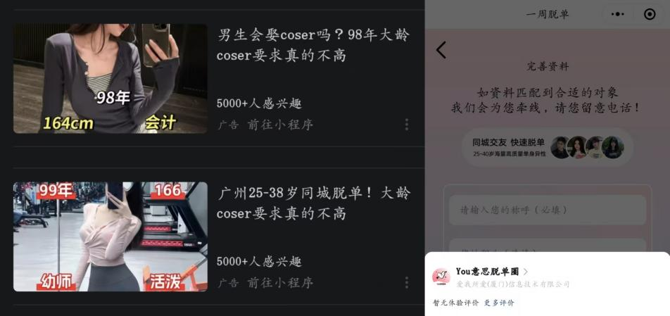 源媒匯注意到,B站上推薦頁面經常主動向用户推送類似的以脱單、線下相親、二次元Coser等標籤吸引用户相親廣告。