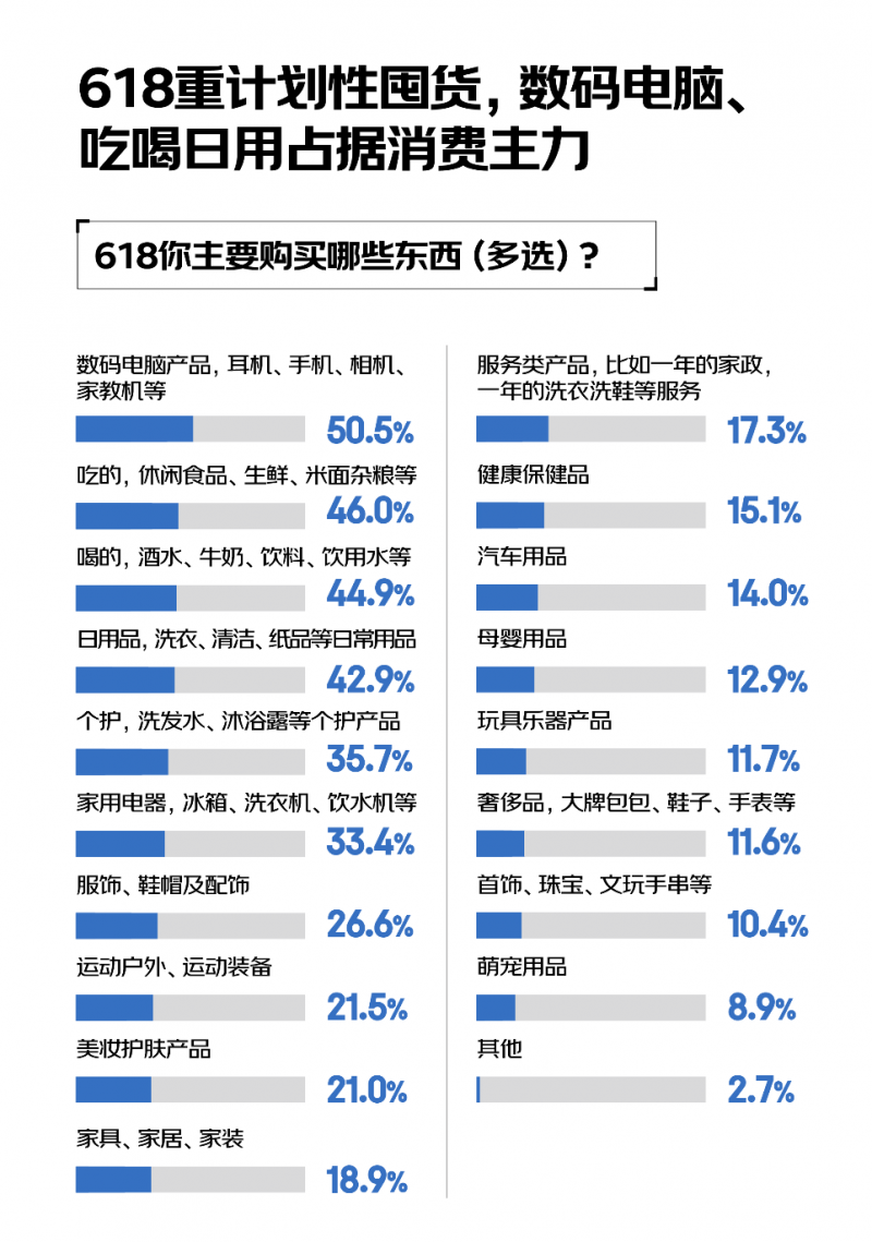 一年一度的618購物狂歡節,是消費者們清空購物車、囤積剛需的絕佳時機。調研顯示,數碼電腦以50.5%的比例成為618期間最被關注的品類,緊隨其後的是休閒食品、生鮮等吃的(46%),酒水、牛奶等喝的(44.9%)以及清潔、紙品等日常用品(42.9%)。對消費者而言,618大促是一場有計劃、有重點的“囤貨大戰”,大家瞄準的是能夠提升生活品質的耐用品或是生活必需、高頻消耗的日用品,消費行為呈現出極強的計劃性與目的性。