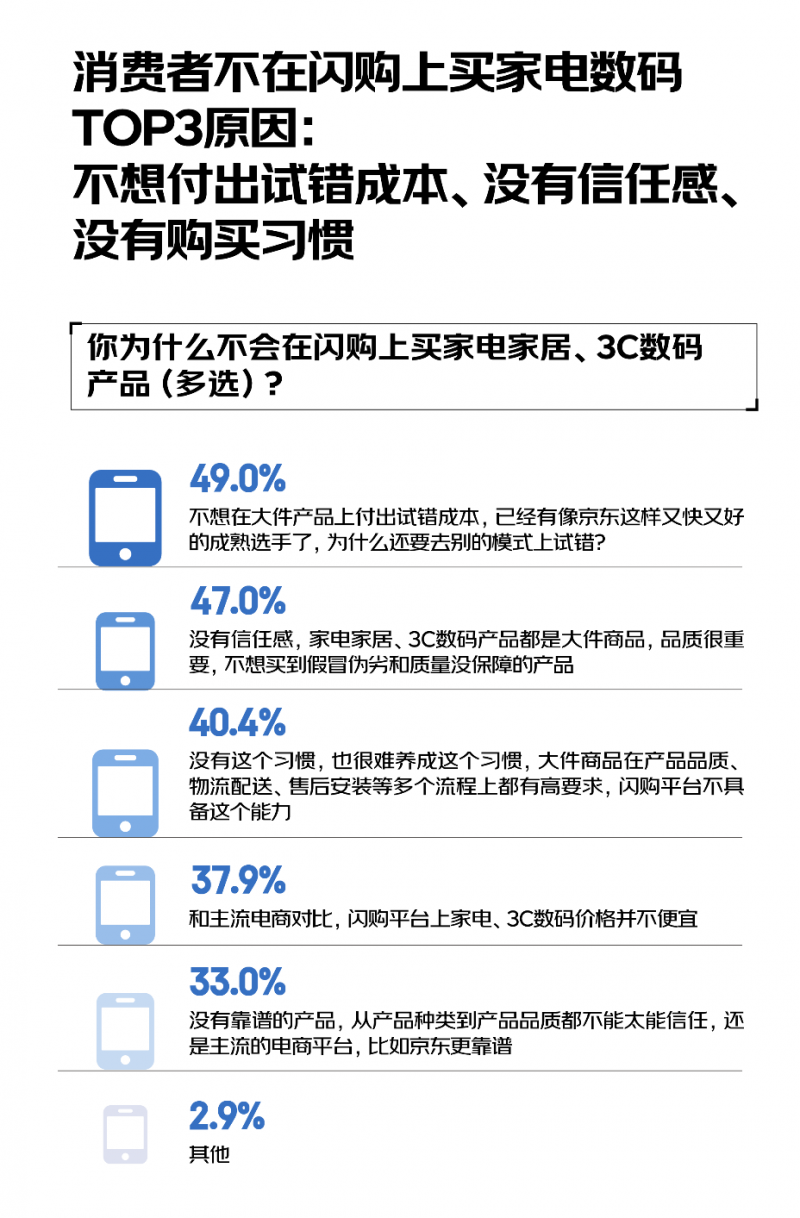 在家電家居、3C 數碼領域,消費者的顧慮更為突出,不想付出試錯成本、沒有信任感、沒有購買習慣是消費者選擇不在閃購上買的主要原因,合計佔比65.7%。其中,49.0%的消費者不願為大件商品承擔試錯成本,“已經有像京東這樣又快又好的成熟選手了,為什麼還要去別的模式上試錯”。47.0%的消費者認為這些大件商品品質至關重要,而閃購平台難以提供與之匹配的品質保障。即便有閃購平台接入品牌門店甚至支持大家電送裝一體,消費者仍認為“手機電腦需官方售後”“大家電安裝依賴專業服務”——這些恰恰是京東等主流電商平台深耕多年的護城河。