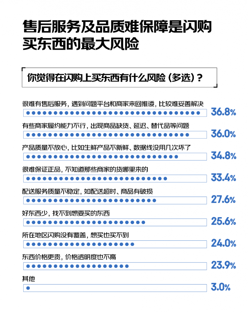 售後與品質問題,無疑是懸在閃購平台頭頂的達摩克利斯之劍。調研顯示,36.8%的消費者認為閃購售後服務難保障,遇到問題時,平台與商家相互推諉,讓消費者陷入漫長的維權拉鋸戰,既耗費時間又耗費精力;36.0%的消費者表示商家履約能力不行,商品缺貨、延遲交付等問題頻發,打亂了消費者的使用計劃;34.8%的消費者對產品質量心存疑慮,購買到的生鮮不新鮮、電子產品易損壞等狀況時有發生;33.4%的消費者擔心難以保證商品正品,尤其在購買知名品牌商品時,總是提心吊膽,生怕買到假貨。