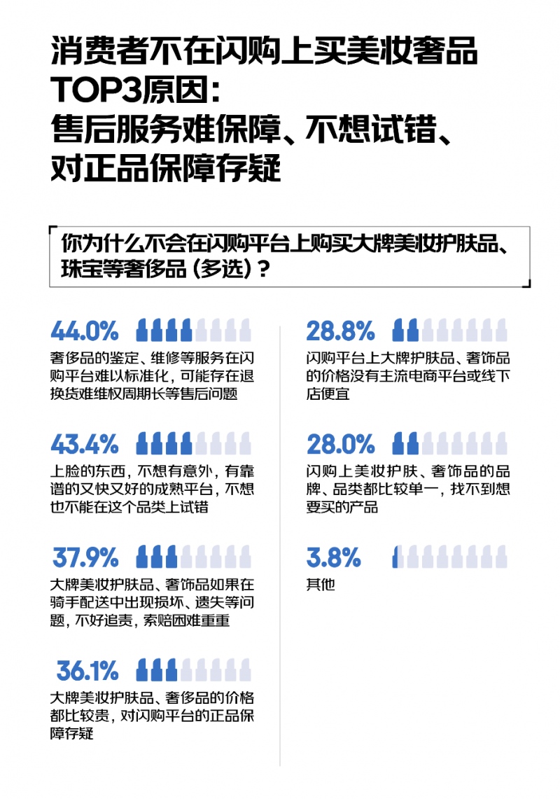 在大牌美妝護膚品、珠寶等奢侈品領域,有72.7%的消費者不在閃購上買是因為售後服務難保障、不想試錯和對正品保障存疑。其中,44%的消費者擔憂售後問題,如退換貨難、維權週期長等;43.4%的消費者出於對產品質量的考量,尤其是化妝品直接接觸皮膚,任何質量問題都可能對皮膚造成傷害,因此不敢在閃購平台輕易下單。