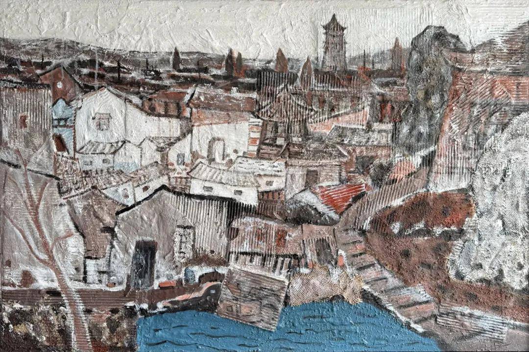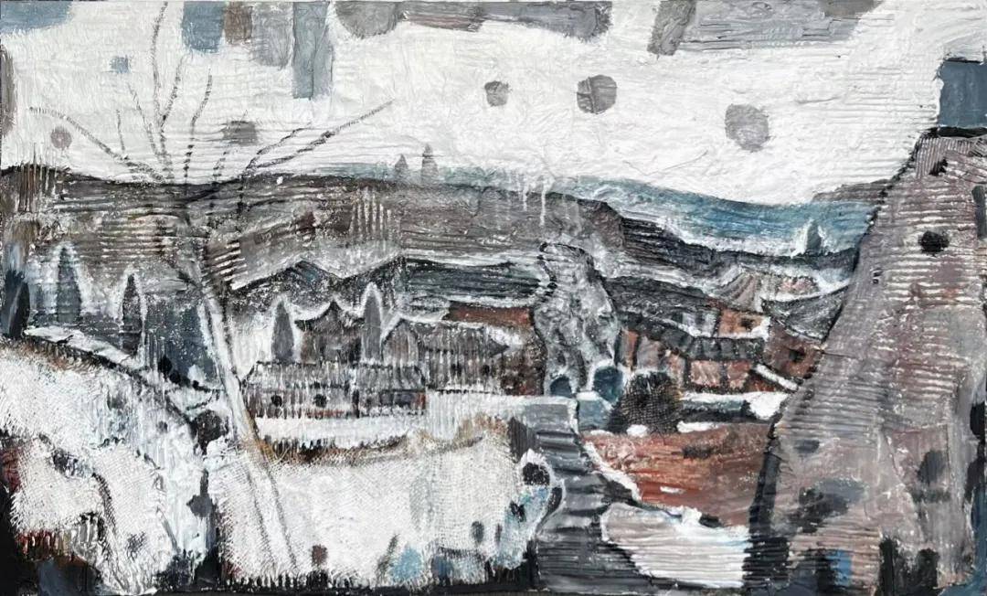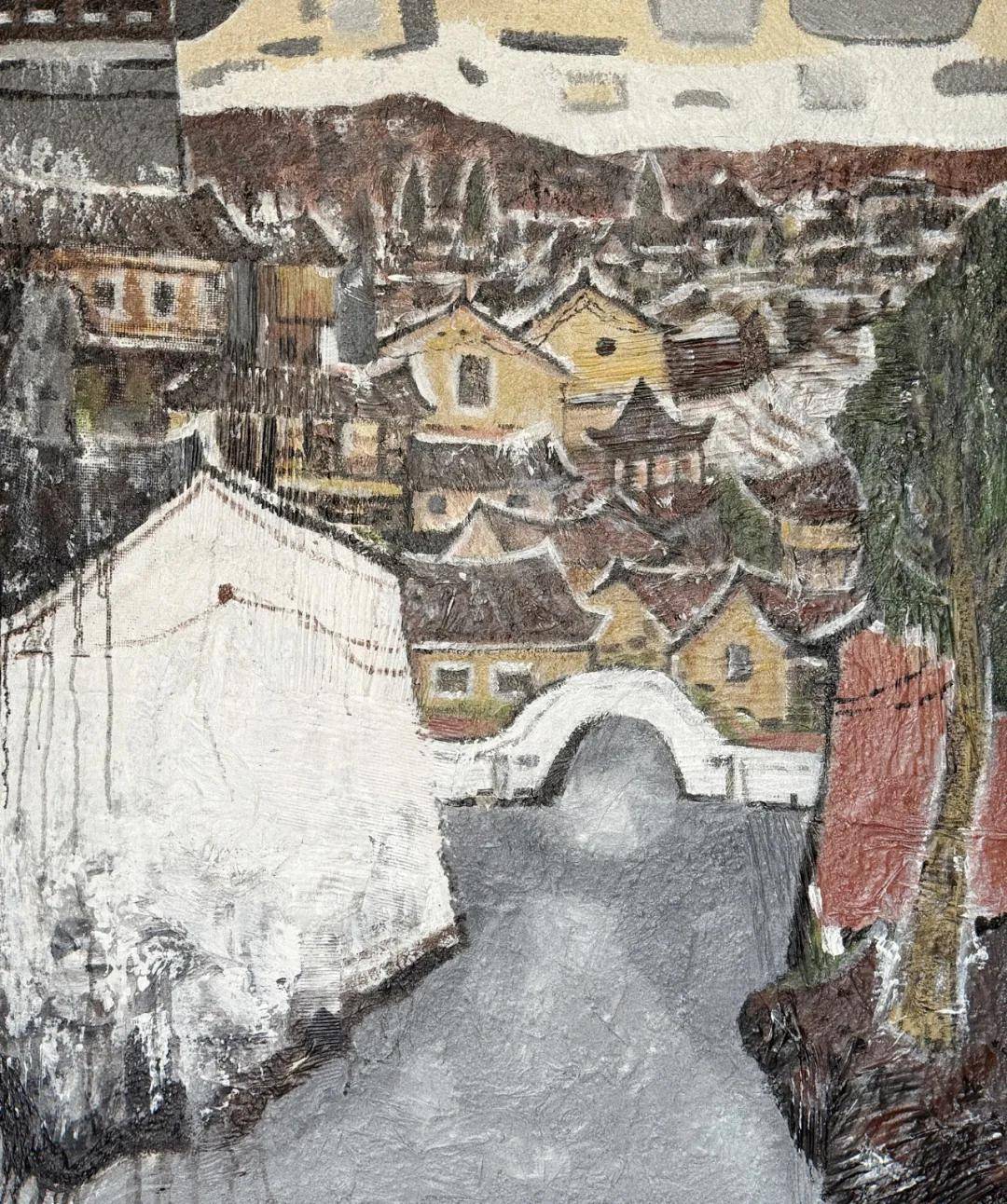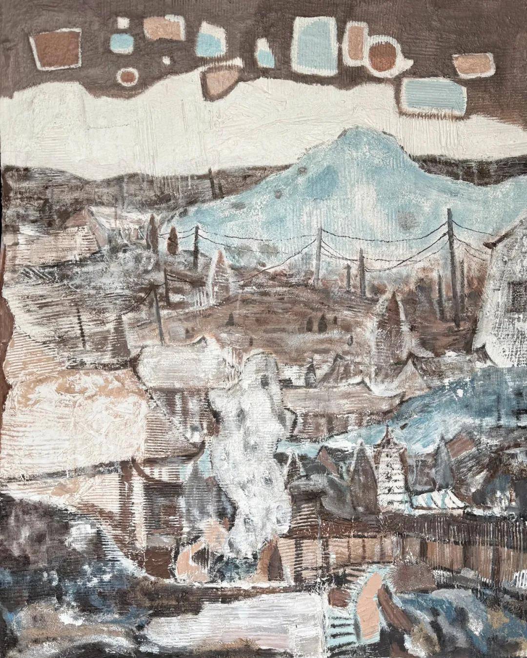 這批新作裏,不少作品用俯視和遠視視角構建畫面,空間感強烈。畫中一些建築羣落,古樸、滄桑,喚起了觀者對歷史與時間的思索。部分作品中,房屋、佛塔、山脈、電線杆等元素看似隨意分佈,卻在整體上形成一種內在秩序。房屋以變形、誇張的方式呈現,體現出陳允光對蘇北所見之景的主觀處理。遠處山巒與前景房屋相互呼應,電線杆和電線的穿插增添了畫面的縱深感與生活氣息。天空部分由不規則色塊構成,打破了常規天空的表現形式,進一步強化了畫面的抽象感與表現主義風格。或許在陳允光的記憶深處,蘇北那美好的自然景象,就該以這種寧靜且抽象的方式呈現,給人予無盡的思考。