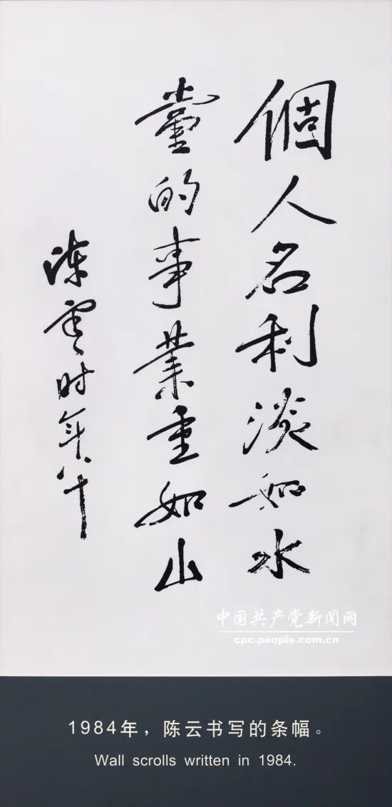 即便是身處逆境,陳雲始終堅定信仰,以黨和國家大局為重,從不計較個人得失。關於個人與功績,陳雲的見解深邃而清醒。“頭一個是人民的力量,第二是黨的領導,第三才輪到個人。”他多次強調,任何人離開了人民,離開了黨,一件事也做不出來。晚年時,陳雲書寫下一副詩聯:“個人名利淡如水,黨的事業重於山。”這是陳雲對自己的嚴格要求,也是他幾十年如一日不忘初心、牢記使命的生動寫照。