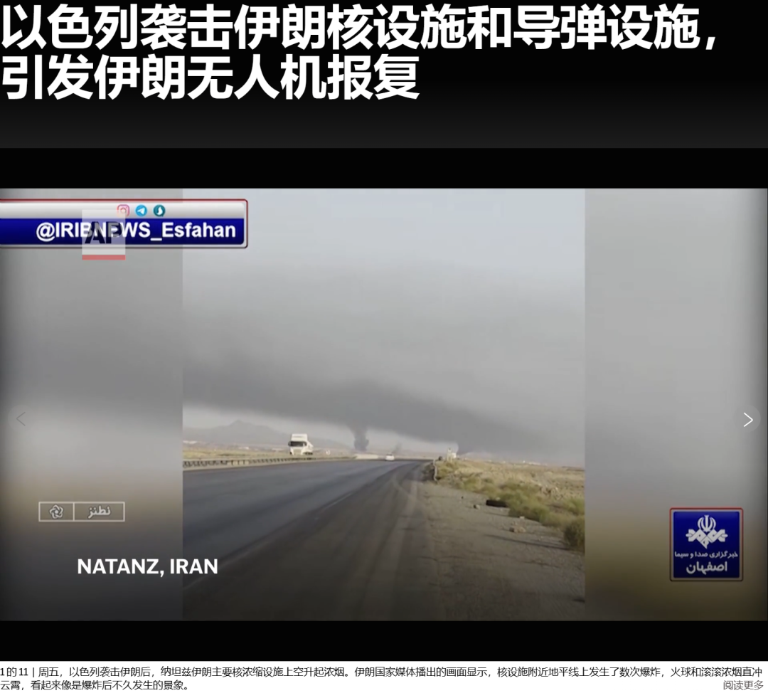 伊朗西北部人口最多的城市——大不里士一處核研究中心與兩處軍事基地附近發生爆炸;伊朗第三大城市伊斯法罕、西部城市克爾曼沙阿與伊拉姆、西南部城市“石油之都”阿瓦士,以及阿拉克重水反應堆所在的工業重鎮阿拉克均遭到以軍襲擊……