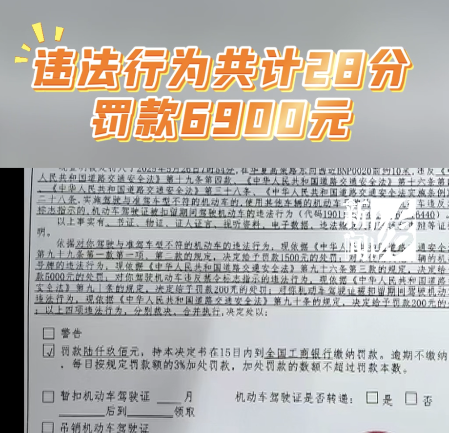 所有違法行為共計28分,罰款6900元,並因為駕駛與準駕車型不符的機動車的行為,處以行政拘留7天的處罰。