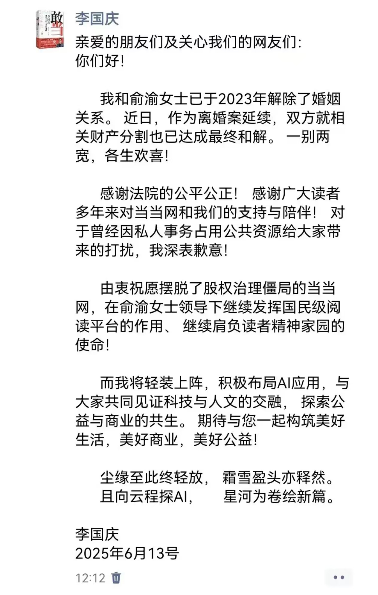 6月13日,噹噹創始人李國慶在朋友圈發文稱:我和俞渝女士已於2023年解除了婚姻關係。近日,雙方就相關財產分割也已達成最終和解。一別兩寬,各生歡喜!