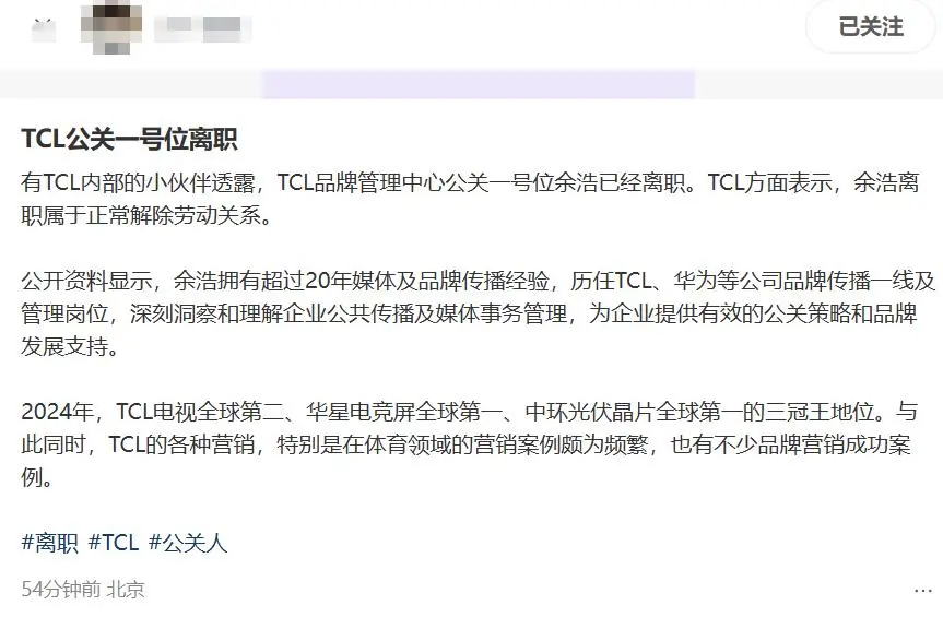 TCL公關負責人餘浩離職引關注,魏雪接任一號位?_風聞