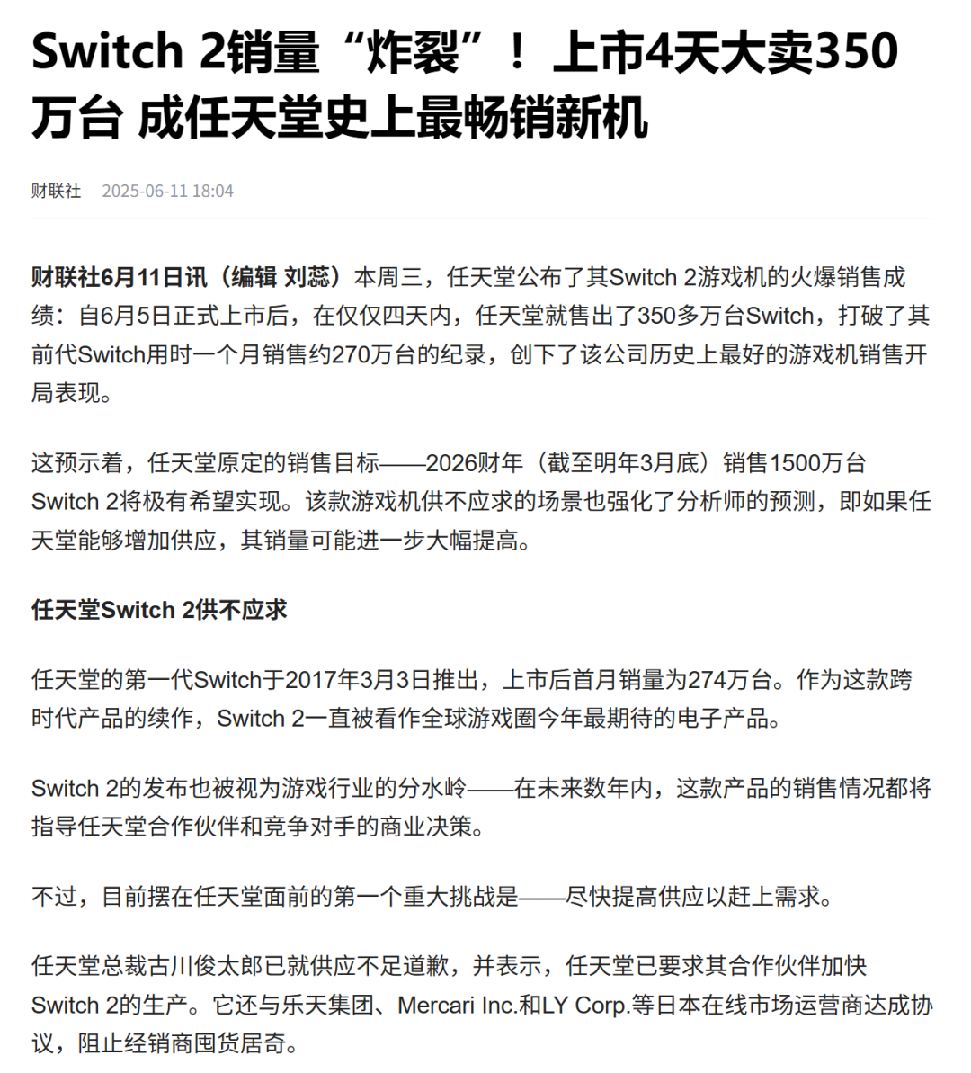 NS2 上市 4 天的銷量,居然直接破了 350 萬。