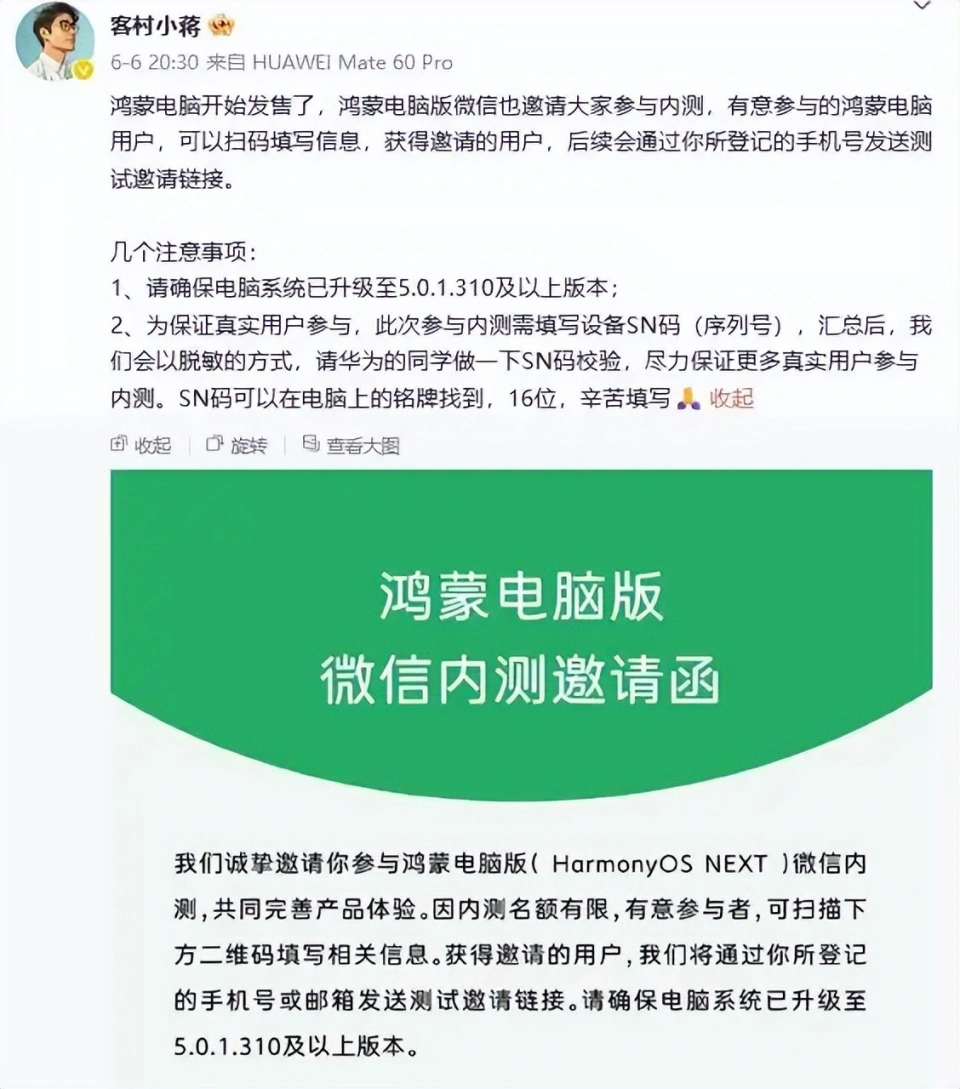 事情是這樣的,6 月 6 日的時候,微信鴻蒙電腦版也開始了內測。