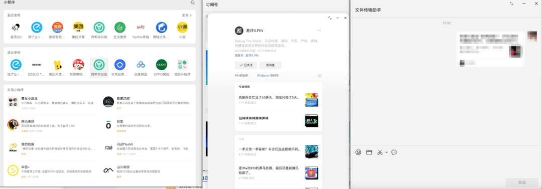 其他功能上,基本可以説 Windows 和 MacOS 的微信有的,鴻蒙電腦的微信也都有了。基礎的聊天、文件傳輸、小程序、公眾號這些基本都能正常使用。