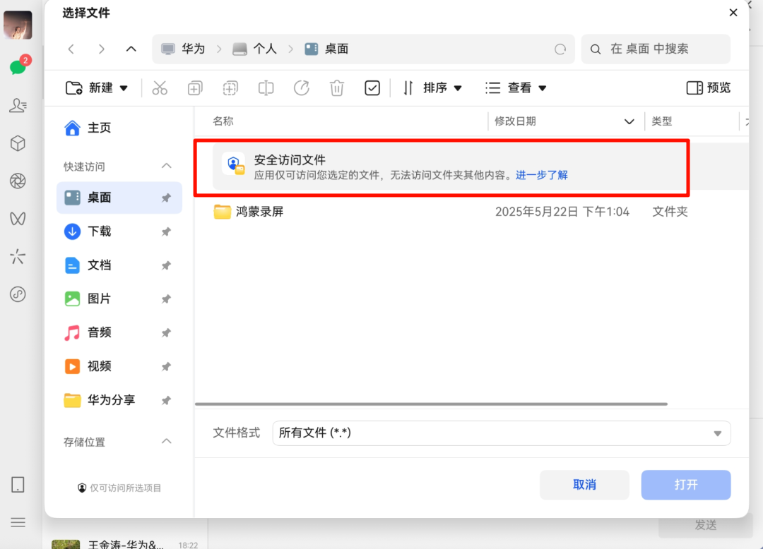 比如當要傳輸文件時,彈出的文件管理器會提醒你,你正在安全訪問文件,微信並不能直接查看你電腦上所有的問題件內容,只能拿到你選中的文件。