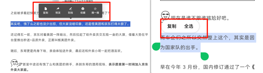 而在手機端,選中文字之後依舊只能基礎的複製和全選。