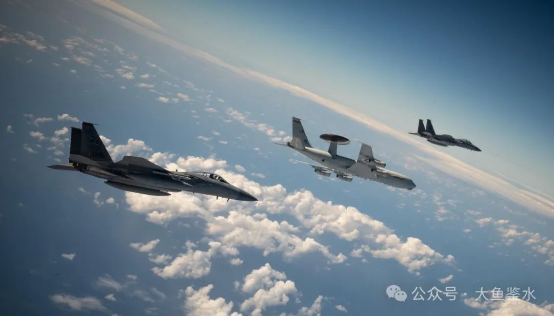> 2020年10月16日,第18聯隊的2架F-15C和一架E-3預警機編隊飛行在嘉手納空軍基地上空