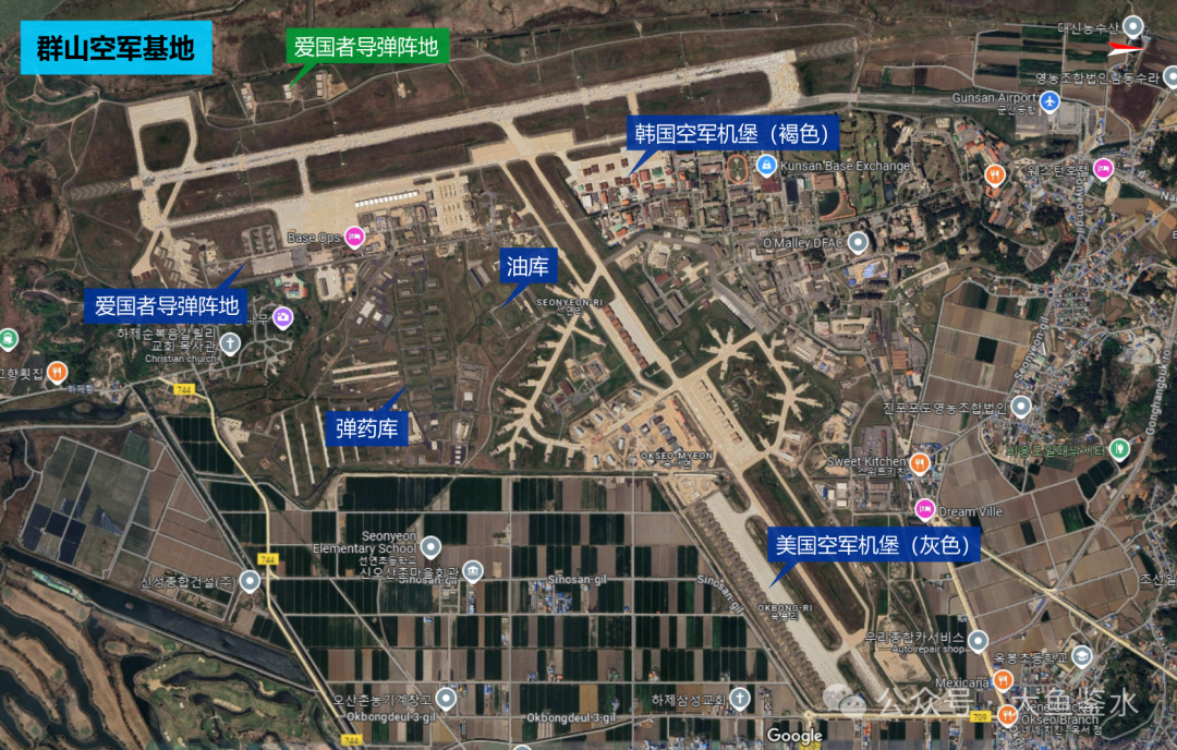 羣山空軍基地位於韓國西海岸中部,首爾以南180公里,為美韓空軍共用。過去東北-西南方向的跑道已經廢棄改為滑行道,兩側闢為加固機堡和停機坪。在靠海一側新修築了2743米長的南北走向跑道,起降航線的淨空條件更好。主跑道東南側有陸軍第35防空炮兵旅2營的2處愛國者導彈陣地。