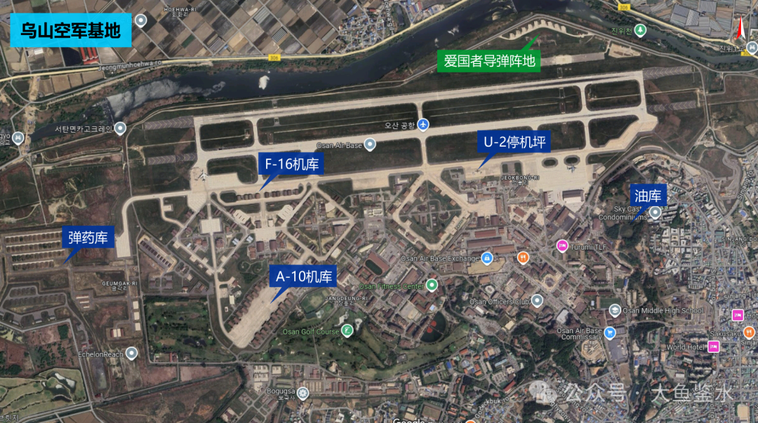 烏山空軍基地位於首爾以南64公里,為美軍第7航空隊和第51戰鬥機聯隊駐地,也是韓國空軍作戰司令部所在地,兩條平行的跑道長2744米,彈藥庫位於機場西端,地下油庫位於東端,東北角構築了陸軍第35防空炮兵旅1營的愛國者導彈陣地。因為臨近三八線,烏山基地的防護等級非常高,設有大量加固機堡,停機坪也都築有防爆牆。