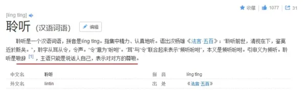“聆聽”在《現代漢語詞典(第7版)》中的解釋是“聽”,許蕾指出,但是這個“聽”在日常使用中是帶有尊敬、恭敬的色彩,多用於下級對上級或晚輩對長輩的話語的認真聽取。