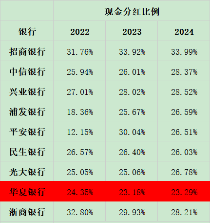 在9家A股股份行中,華夏銀行不僅是為數不多的分紅比例整體下滑的銀行之一,而且在現金分紅比例方面,華夏銀行2024年僅為23.29%,是唯一一家分紅比例沒有超過25%的股份行,處於行業墊底狀態。