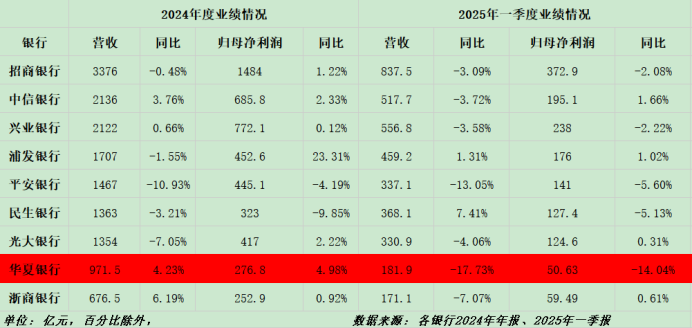 華夏銀行今年一季度業績表現在A股9家股份行中屬於墊底,營收、歸母淨利潤的降幅均是A股股份行中最大的。