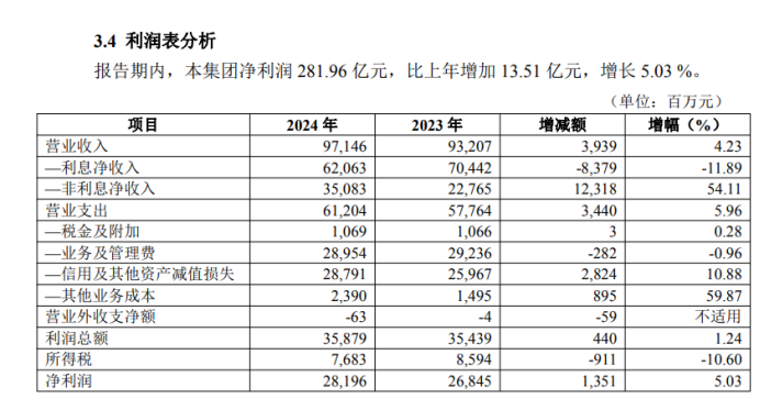 年報數據顯示,2024年華夏銀行營業收入971.5億元,同比增加4.23%,歸母淨利潤276.8億元,同比增加4.98%。